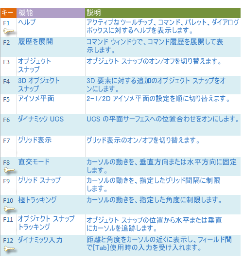 AutoCAD では、キーボードのすべてのファンクション キーに割り当てができます。頻繁にオン/オフを切り替える機能には、割り当てられているキーが表示されます。