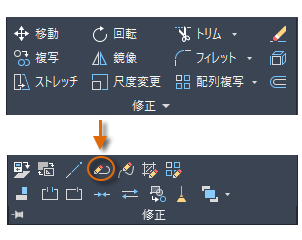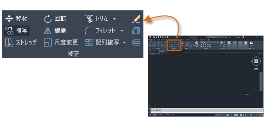 図面内のオブジェクトに対して、削除、移動、トリムなどの操作を実行します。