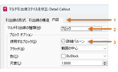 たとえば、「バルーン」を作成するには、MLEADERSTYLE[マルチ引出線スタイル管理]コマンドを開始します。[マルチ引出線スタイル管理]ダイアログ ボックスで[新規作成]をクリックし、新しいマルチ引出線スタイルの名前を決めます。[コンテンツ]タブをクリックし、[ブロック]を選択し、次に示すように[詳細バルーン]を選択します。