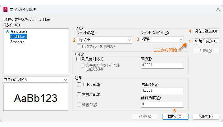 新しい文字スタイルを作成するときは、名前を指定してから、フォントとフォント スタイルを選択します。ボタンをクリックする順番は、次のとおりです。