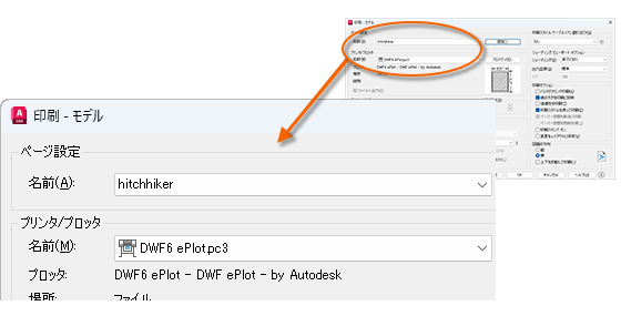 印刷する場合、[印刷]ダイアログ ボックスでページ設定の名前を指定するだけで、その印刷設定のすべてが呼び出されます。次の図では、[印刷]ダイアログ ボックスは、プロッタではなく DWF (Design Web Format)ファイルへの出力用である[Hitchhiker]ページ設定を使用するように設定されています。