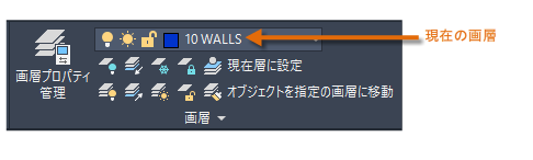 [画層プロパティ管理]は非常にスペースを取りますし、常にすべてのオプションが必要であるわけではありません。最も一般的な画層コントロールにすばやくアクセスするには、リボンのコントロールを使用します。オブジェクトが選択されていない場合、ここに示したように、[ホーム]タブの[画層]パネルに現在の画層の名前が表示されます。