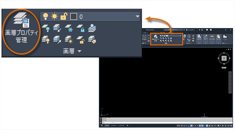 図面の編成方法を確認するには、LAYER[画層管理]コマンドを使用して、[画層プロパティ管理]を開きます。コマンド ウィンドウで LAYER または LA と入力したり、リボンの[画層プロパティ管理]ツールをクリックして表示します。