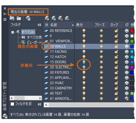 次に示すのは、[画層プロパティ管理]の最も一般的に使用される画層の設定です。設定のオン/オフを切り替えるには、アイコンをクリックします。