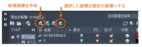 新しい画層を作成するには、下図の[新規画層を作成]ボタンをクリックし、新しい画層の名前を入力します。別の画層を現在の画層にするには、画層をクリックし、次に[現在に設定]ボタンをクリックします。