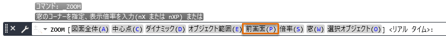 直前のビューが表示されます。また、コマンドまたはコマンド エイリアスを入力してから[Spacebar]または[Enter]キーを押すと、「ZOOM コマンドを入力」というような略した説明が表示されることがよくあります。