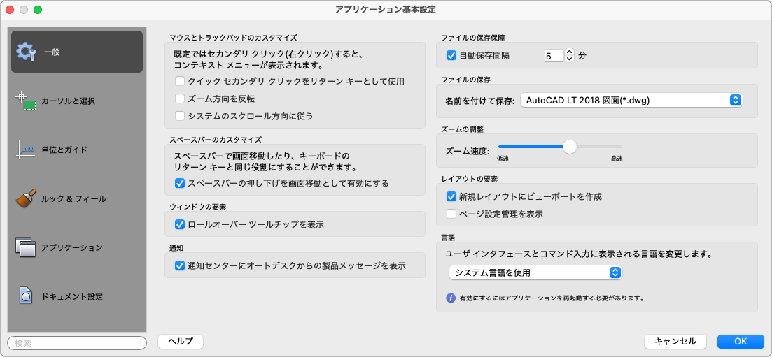 マウスのホイールを前方または後方に回転したとき、または Magic Mouse やトラックパッドでシングル スワイプしたときに、表示倍率がどれだけ変更されるかをコントロールします。(システム変数 ZOOMFACTOR)
