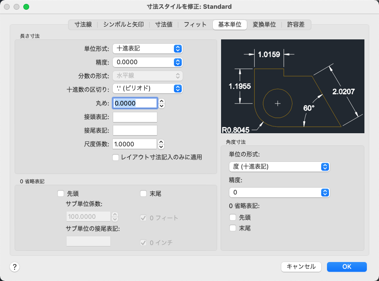 基本寸法単位の形式と精度を設定したり、寸法値の接頭表記と接尾表記を設定します。