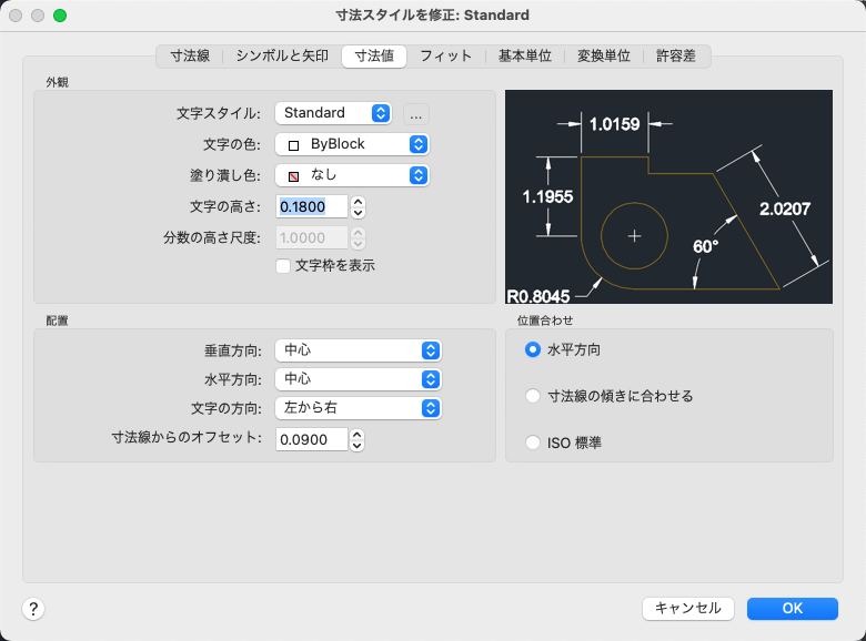 現在の寸法値の文字スタイルの高さを設定します。テキスト ボックスに値を入力します。文字スタイルで文字の高さが固定されている場合(文字スタイルの高さが 0 より大きい場合)、ここで設定した文字の高さは無視され、文字スタイルで設定した文字の高さが使用されます。文字の高さを[寸法値]タブで設定した高さにする場合は、文字スタイルの文字の高さを必ず 0 (ゼロ)に設定しておいてください。(システム変数 DIMTXT[寸法値高さ])
