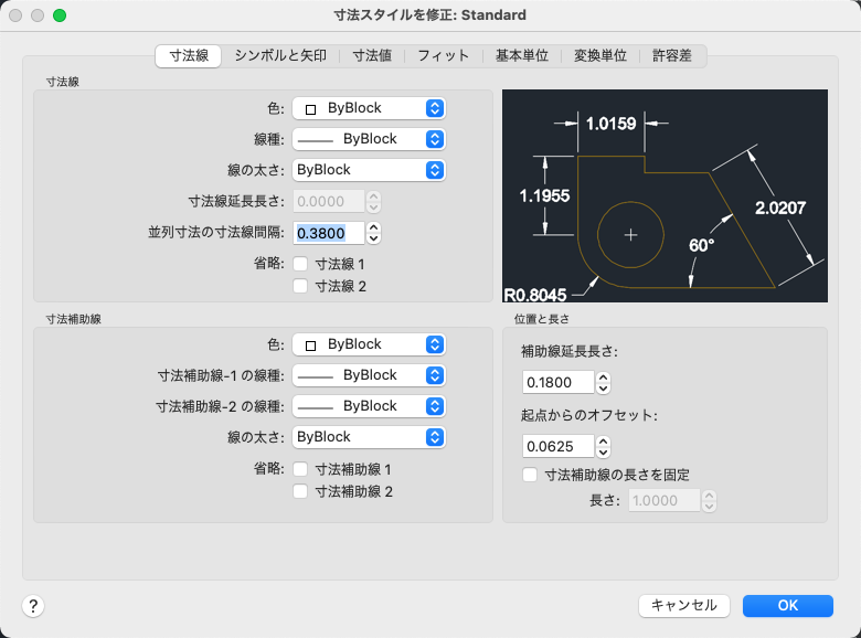 寸法線、寸法補助線、矢印、中心マークの形式とプロパティを設定します。
