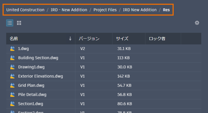 - プロジェクトの図面リストの上に、現在のプロジェクト パスのナビゲーション用階層リンクが表示されます。