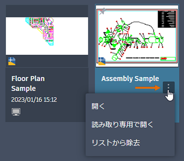 - 図面のサムネイルにカーソルを合わせると、メニューを開くアイコンが表示されます。クリックすると、メニューのオプションが表示されます。