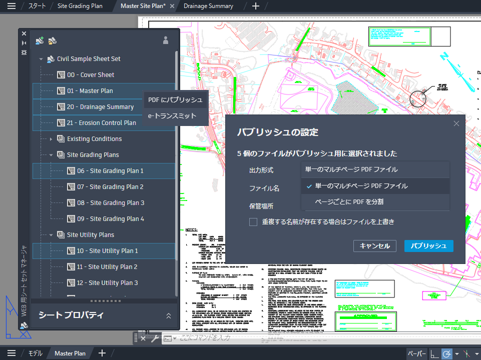 変更点には、パブリッシュするシートを複数選択する機能、選択したシートをパブリッシュまたは転送する方法を定義する機能、PDF (または e-トランスミット)ファイルの名前と場所を詳細にコントロールする機能、パブリッシュおよび e-トランスミット時に既存のファイルを上書きするオプションなどがあります。