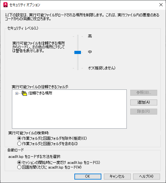 | SECURELOAD | 実行可能ファイルのロード元を信頼できるフォルダのみに制限するかどうかをコントロールします。 | 1、CAD 管理者によってロックされている場合があります | レジストリ |