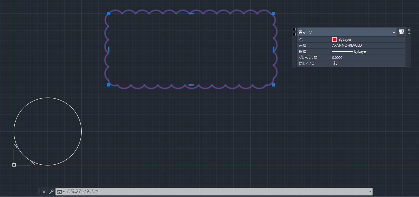 赤色の雲マークが、画層 A-ANNO-REVCLD に配置されます。これは、リボンの[画層]パネルの[画層]ドロップダウン リストまたは[プロパティ] / [クイック プロパティ]パレットで確認できます。