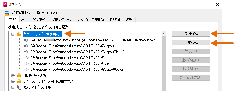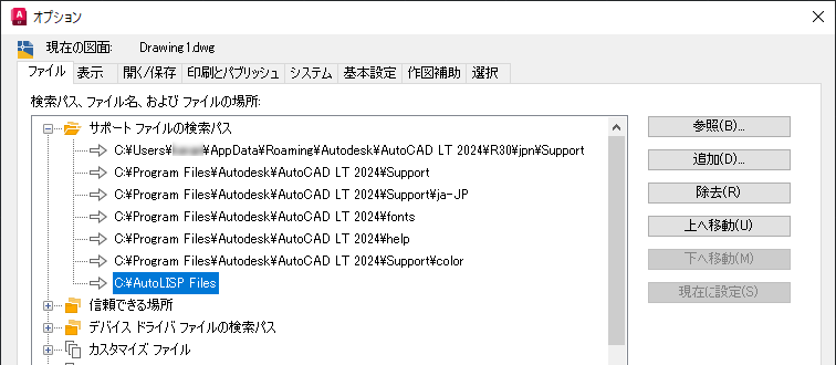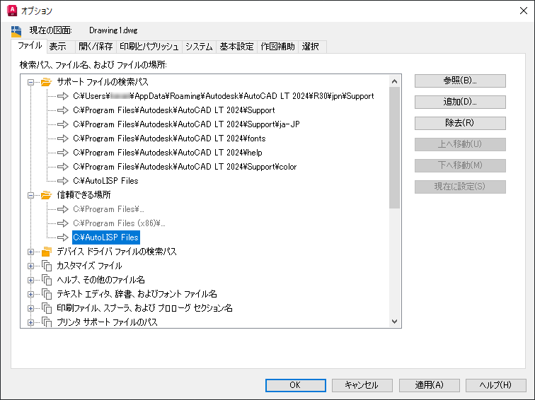 AutoLISP ファイルを保存するフォルダを決めたら、[オプション]ダイアログ ボックスの[ファイル]タブの[サポート ファイルの検索パス]と[信頼できる場所]の設定を使用して、フォルダの場所を AutoCAD LT に通知する必要があります。AutoCAD LT は、次の理由により、LSP ファイルの場所を認識する必要があります。