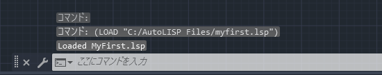ロードが完了すると、prompt 関数によって、コマンド ライン ウィンドウの履歴に「Loaded MyFirst.lsp」というメッセージが表示されます。