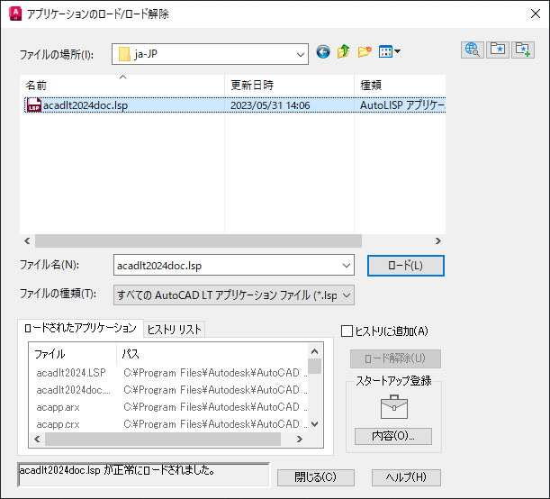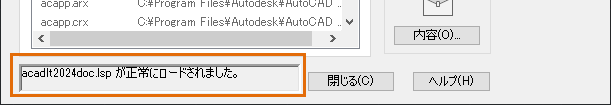ダイアログ ボックスの左下のメッセージボックス、およびコマンド ライン ウィンドウに、"acadlt2024doc.lsp が正常にロードされました。" と表示されます。