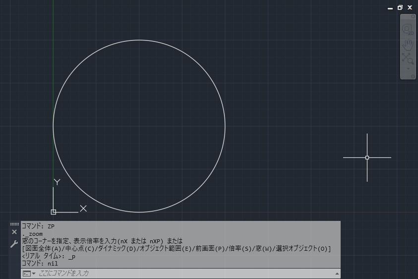 円が図面内の唯一のオブジェクトである場合は、円のオブジェクト範囲がズームされ、それ以外の場合は、図面内のすべてのオブジェクトのオブジェクト範囲がズームされます。