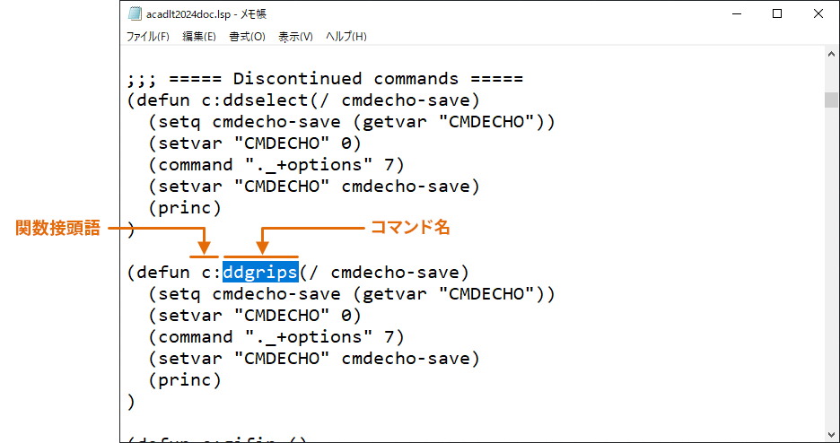 次の図は、[メモ帳]で開いた acadlt2024doc.lsp ファイルの一部を示しています。コマンド プロンプトに対して入力できる AutoLISP 定義コマンドには、c: という接頭語が付きます。c: の直後の文字は、コマンドの名前です。