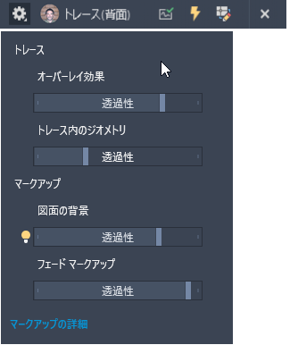 [トレース内のジオメトリ」]:背景のトレースジオメトリのフェード量をコントロールします。TRACEFRONT がオンの場合、図面内のジオメトリに影響します。TRACEBACK がオンの場合、トレース内のジオメトリに影響します。[トレースのジオメトリ]スライダによって、システム変数 TRACEADECTL が変更されます。
