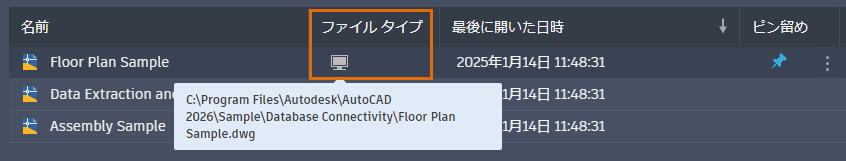 - どちらの表示でも、ファイル タイプ アイコンにカーソルを合わせると、ファイルのソース パスが表示されます。