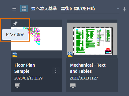 - グリッド表示: ピン アイコンが表示されるまで、ファイル サムネイルの左上にマウスを移動します。クリックしてファイルをピンで固定します。