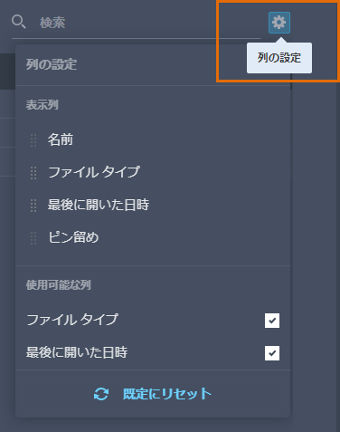リスト表示の右上コーナーにある[列の設定]アイコン(歯車)を使用して、表示する列とその順序を切り替えて表示をカスタマイズできます。[名前]列と[ピン留め]列は、常に最初および最後の列として表示されます。