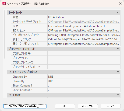 [シート セットのカスタム プロパティ]ダイアログ ボックスが表示されます。