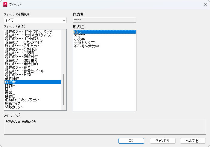 この項目のラベルは、フィールド名によって異なります。たとえば、[フィールド名]リストから[ファイル名]を選択すると、ラベルは「ファイル名」、値は現在の図面ファイルの名前になります。オブジェクト フィールドのラベルは「プロパティ」です。例外: 日付フィールドを選択した場合は、選択した日付の形式(たとえば M/d/yyyy)が表示されます。