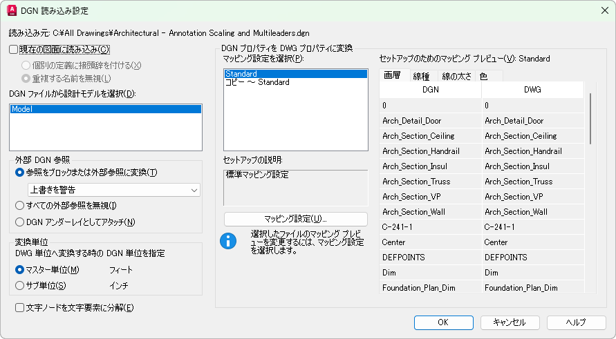 変換に適した変換単位を選択します。読み込まれた DGN ファイルには、 「マスター単位」と 「サブ単位」と言われる作業単位(フィート/インチ単位かメートル単位)が含まれます。選択した作業単位(マスター単位またはサブ単位)は、DWG の単位に 1 対 1 で変換されます。