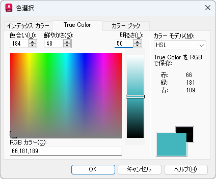 RGB カラー モデルを使用して、色を選択します。[True Color]タブで使用できるオプションは、HSL と RGB のどちらのカラー モデルを指定するかによって異なります。