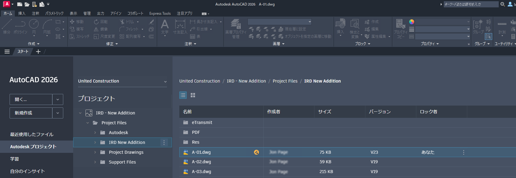 - Desktop Connector で最初のプロジェクトを選択したら、AutoCAD の[スタート]ページで[Autodesk プロジェクト]をクリックします。