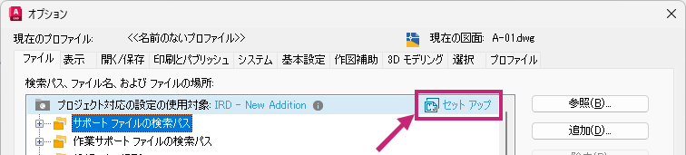 注: [セット アップ]オプションが表示されない場合は、プロジェクトが既に設定済みである可能性があります。これは、「現在の図面はプロジェクト対応の設定を使用しています」というテキストが表示されることで確認できます。