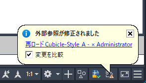 既定では、参照ファイルが変更されると、アプリケーション ウィンドウの右下コーナーに表示されている[外部参照]アイコンの近くにバルーン メッセージが表示されます。バルーンのリンクをクリックすると、変更されたすべての外部参照が再ロードされます。