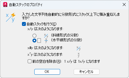 自動スタック機能がオンのとき、スラッシュ(/)を水平線分数に変換します。