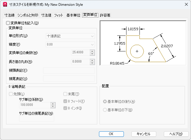 基本単位と変換単位の間の変換係数として使用される乗数を指定します。たとえば、インチをミリメートルに変換する場合は、25.4 と入力します。この値は角度寸法には適用されず、また、丸め値やプラスまたはマイナスの寸法許容差値には適用されません。(システム変数 DIMALTF[併記変換係数])