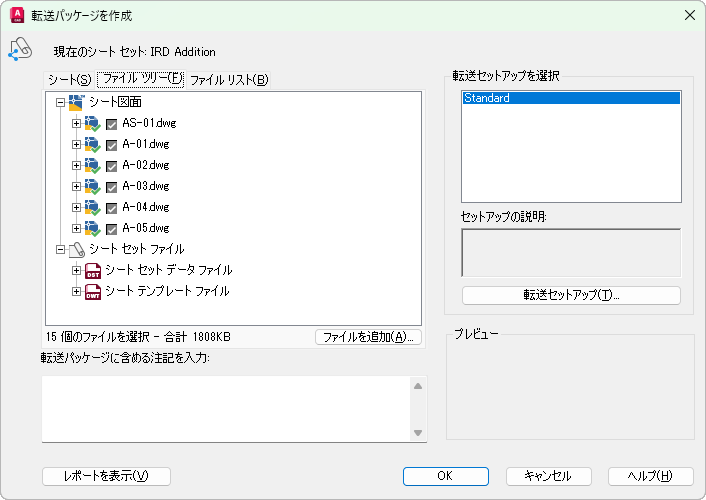 既定では、現在の図面に関連付けらていれるすべてのファイル(関連する外部参照、印刷スタイル、フォントなど)が一覧表示されます。転送パッケージに他のファイルを追加したり、既存のファイルを除外することができます。URL によって参照される関連ファイルは、転送パッケージには含まれません。