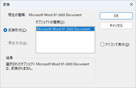 埋め込みオブジェクトを、[オブジェクトの種類]リストから選択した種類に変換します。