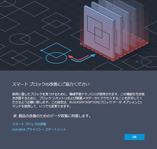 ブロック置換またはブロック変換機能を初めて使用するとき、ブロック データへのアクセスを要求する同意ダイアログ ボックスが表示されます。コンテンツ データを共有すると、AutoCAD のブロック候補表示や他の機能の改善に役立ちます。ただし、製品改善のためのデータ共有を拒否した場合でも、スマート ブロックを使用できます。