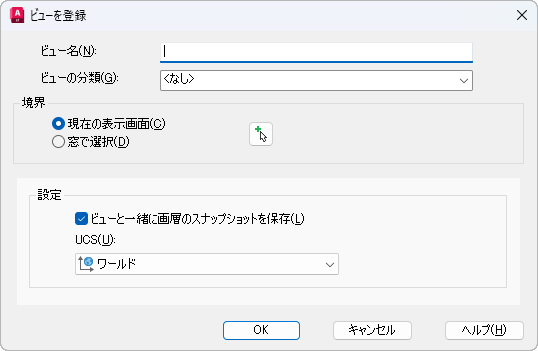 現在のビューポートの表示画面から、または矩形の窓を定義することにより、名前の付いたビューを新規登録します。