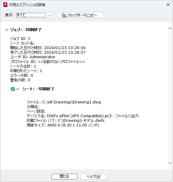すべての完了した印刷とパブリッシュのジョブおよびこれらのジョブのシートに関する情報が表示されます。