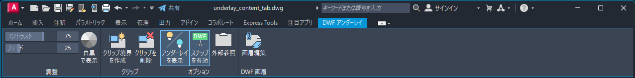 図面内の DWF アンダーレイを選択すると、[DWF アンダーレイ]コンテキスト タブがリボンに表示されます。