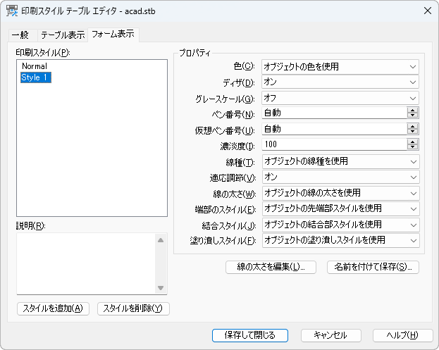 印刷スタイルは表形式で表示されます(リストの一番上にすべての印刷スタイルが左から右へ表示され、その下にそれぞれのプロパティが表示されます)。一般的に、印刷スタイルの数が少ない場合は、[テーブル表示]タブを使用した方が便利です。印刷スタイルの数が多い場合は、[フォーム表示]タブを使用した方が便利です。[フォーム表示]タブでは、左側に印刷スタイル名のリストが表示され、選択した印刷スタイルのプロパティが右側に表示されます。名前の付いた印刷スタイル テーブルの最初の印刷スタイルは Normal(標準)です。これは、オブジェクトの既定のプロパティを表しています(ユーザ定義の印刷スタイルは適用されません)。NORMAL(標準)スタイルは、変更も削除もできません。
