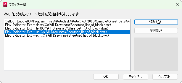 現在のシート セットで使用できるブロックが一覧表示されます。