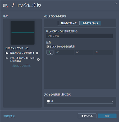 ジオメトリまたはそのインスタンスを既存のブロックに変換する場合、現在の図面からブロックを直接選択できます。または、[変換]ダイアログ ボックスで、次の中から選択します。