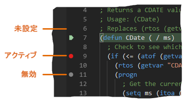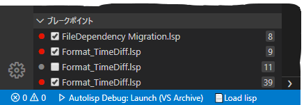 - [Start Debugging]をクリックするか[F5]を押して、アクティブなウィンドウに AutoLISP ソース コードをロードしてデバッグします。