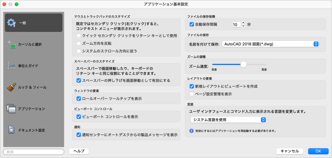 マウスのホイールを前方または後方に回転したとき、または Magic Mouse やトラックパッドでシングル スワイプしたときに、表示倍率がどれだけ変更されるかをコントロールします。(システム変数 ZOOMFACTOR)