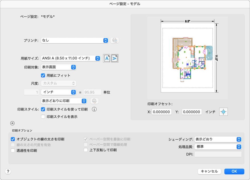 [プレゼンテーション]: レンダリングおよびシェーディングされたモデル空間ビューを、現在のデバイスの解像度(最大 600 dpi)で印刷するように設定します。