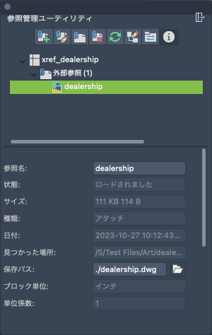 [参照管理ユーティリティ]パレットには、上辺に沿ってツールバーがあります。ファイル リストを右クリックすると、外部参照をアタッチしたり、アタッチした外部参照を管理するためのショートカット メニューが表示されます。選択した外部参照の詳細とサムネイル プレビューを表示するには、ツールバーの[詳細を表示]ボタンをクリックします。